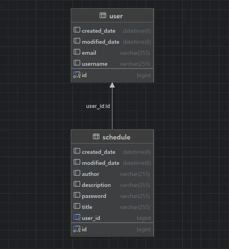 User테이블과Schedule테이블을 분리하여 설계했다. - 이후 두 엔티티를 1:N 관계로 연결했다.