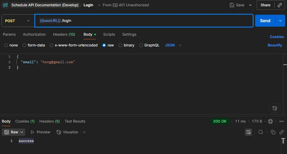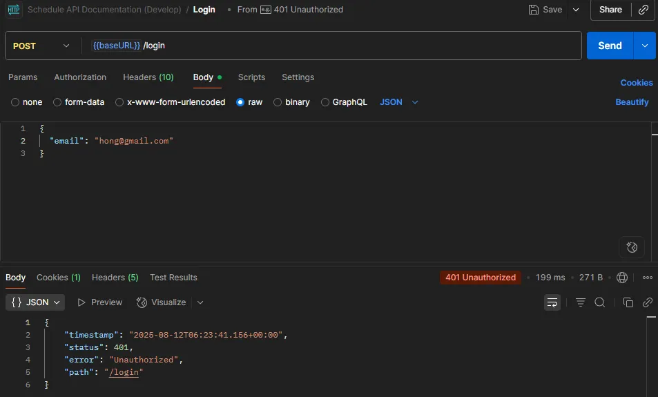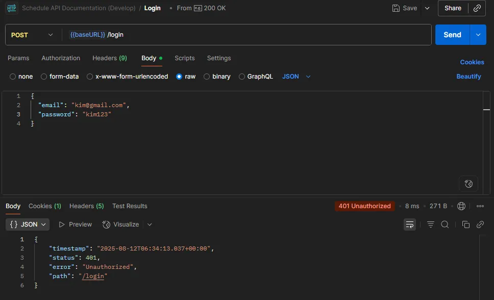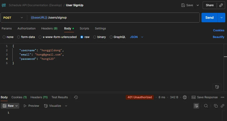 위 코드를 추가하여 비밀번호 입력 여부를 먼저 체크하도록 수정했고 비밀번호가 없으면 401 Unauthorized 오류가 반환되도록 만들었다.