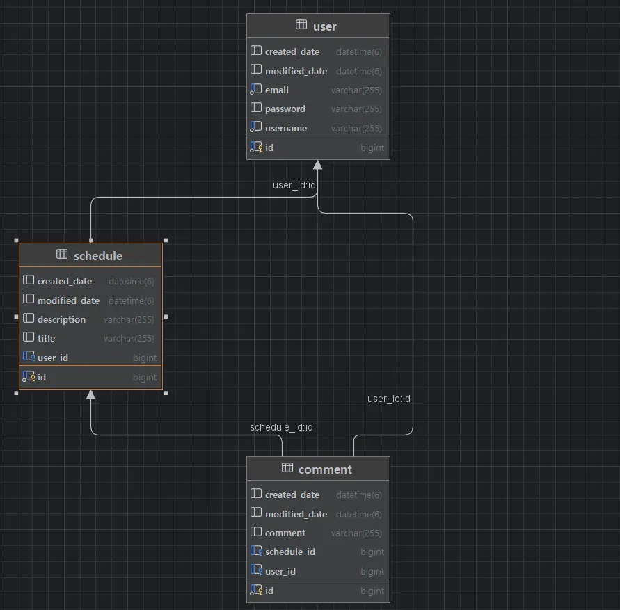 Schedule엔티티에user_id를 외래 키로 저장하여, 어떤 사용자가 어떤 스케줄을 만들었는지 추적 가능하게 했다.