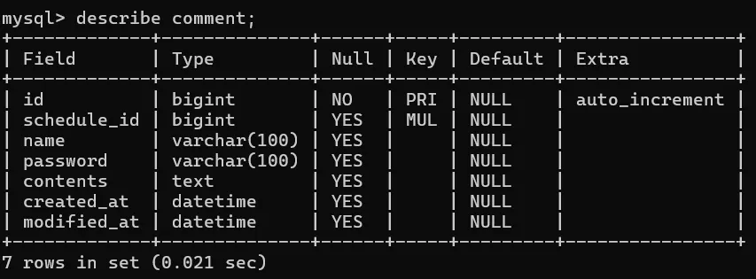 - Comment Table을 별도로 생성하여 schedule_id를 통해 일정과 댓글 간의 외래키 관계 설정