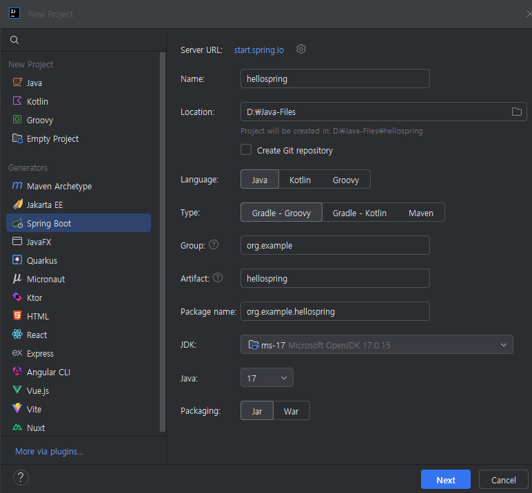 - Spring Initializr(Spring Boot)를 선택하고 아래와 같이 설정